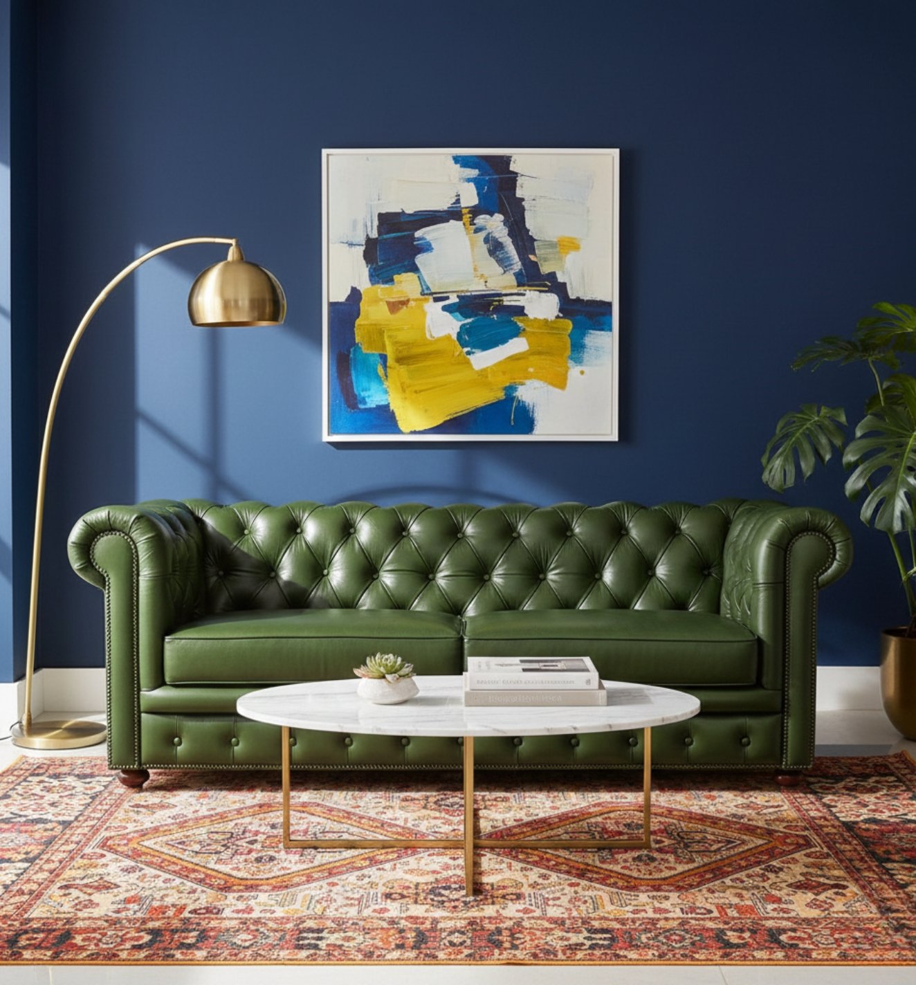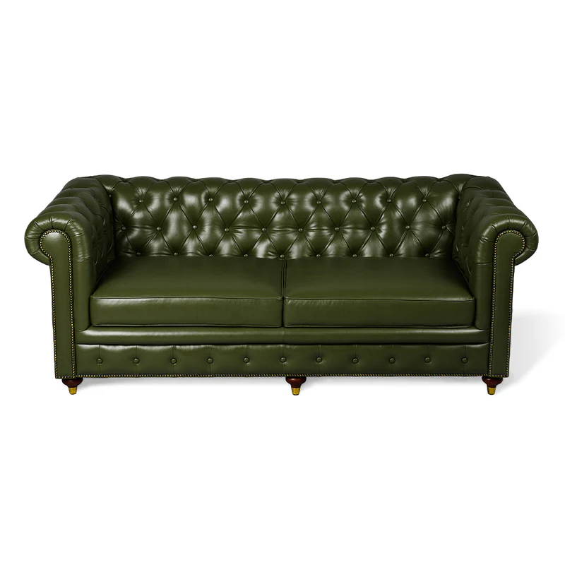 A timeless masterpiece of design and craftsmanship, the Chesterfield Three-Seater Sofa in waxy top grain leather exudes classic elegance. Defined by its deep button tufting, pleated arms, and antique dome rivets, this iconic form is built on a robust wooden frame and features a plush seat with layered foam and latex for enduring comfort. The walnut-stained wooden legs, capped with metal, add a refined finish-perfect for formal living spaces or distinguished lounges.
