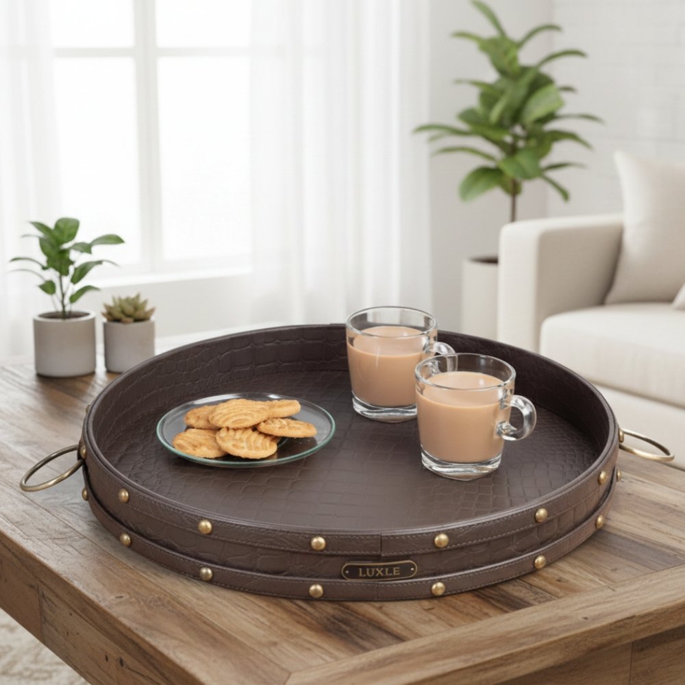 How would you like a voguish round tray nestled on your coffee table or one that makes for the perfect housewarming gift? Designed by in-house craftsmen, and useful addition to your home decor, this beautiful round leather tray is sturdy and everlasting. Embellished with matte brass detailing, it can be used not only as serve ware, but when not entertaining guests, it makes for a sophisticated decorative piece for the coffee table, office, and even as a display tray.