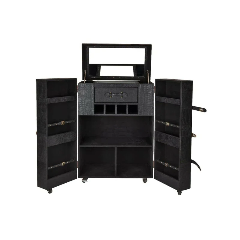 Secondary Material: Plywood and MDF structure, faux suede inner lining, antique brass metal hardware, stainless steel casters, steel frame, PP wheels.