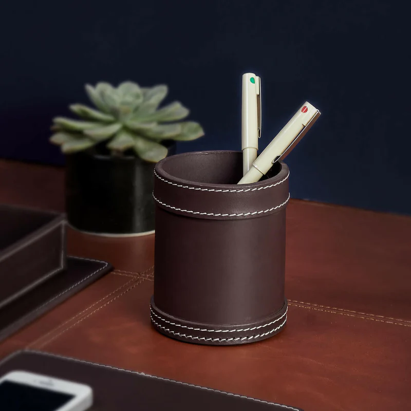 An organized desk feels incomplete without a pen holder. Our CROSS pen cup holder is a functional accessory made in stain-resistant recycled leather with a contrast hand stitch. Its sleek and simple design adds a modern touch to your workspace.