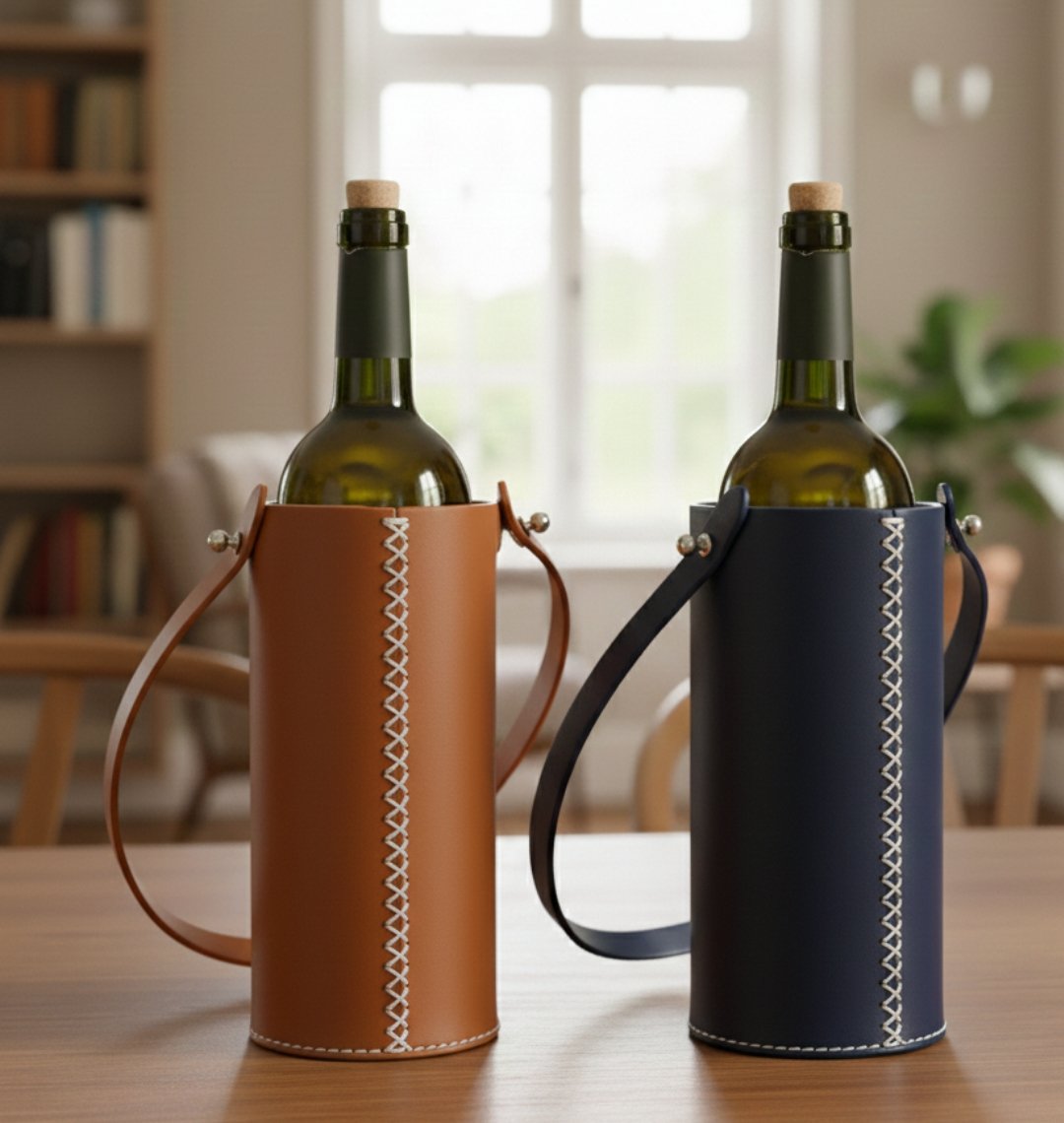 Indulge in some guilt-free gifting with our range of handcrafted and stylish wine bottle holders made from water-resistant recycled leather. Our wine holders are lightweight and sturdy, they come in different designs, with contrasting hand stitch detail and top handles for easy carrying. Carry your favorite bottle of wine out to dinner, to a party with friends, or give as a gift.