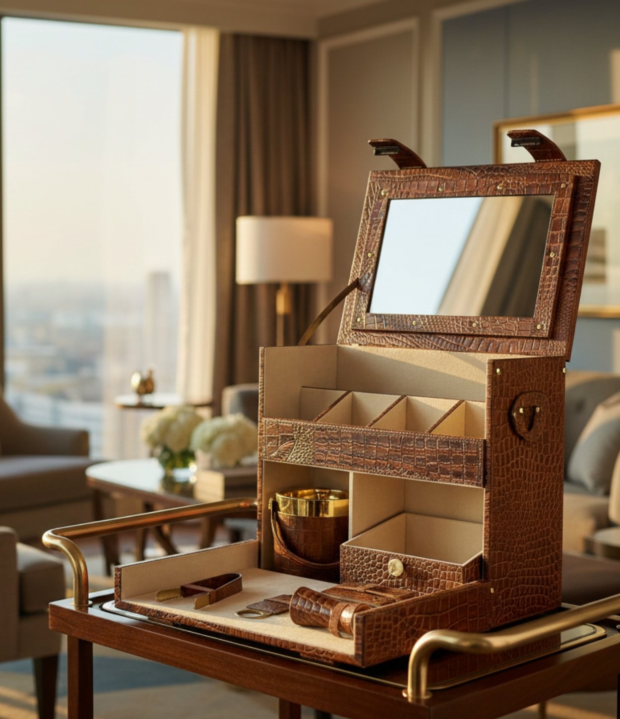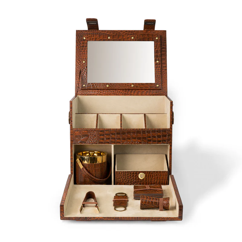 Our Picnic Portable Bar is the perfect accessory for your next outdoor gathering! Handcrafted in Genuine Leather croco finish, it’s lightweight and easy to carry. This bar is spacious enough which makes it perfect for serving drinks and snacks, and has been thoughtfully designed to hold all the essential bar items in a modern way, thus adding a touch of class wherever you go!