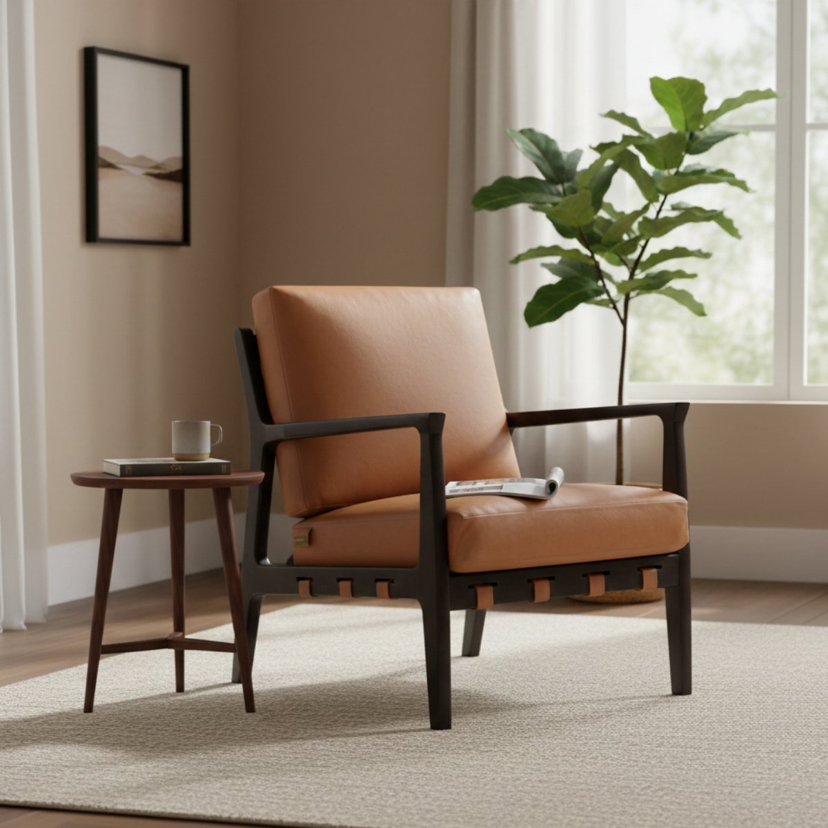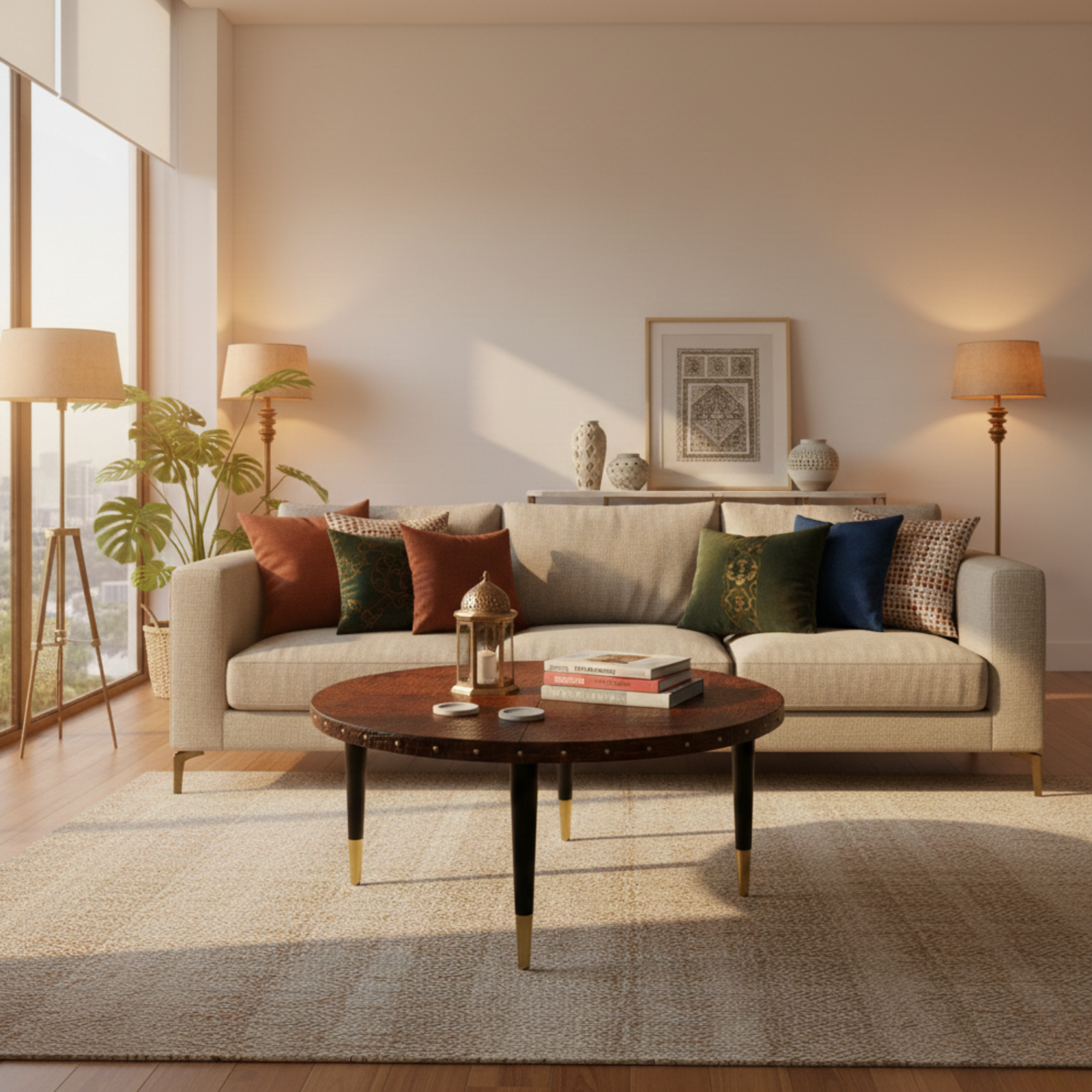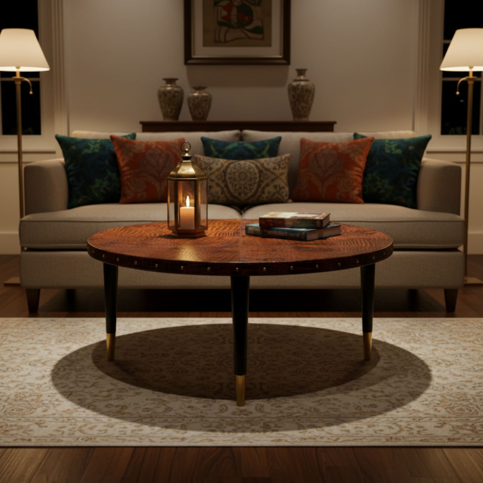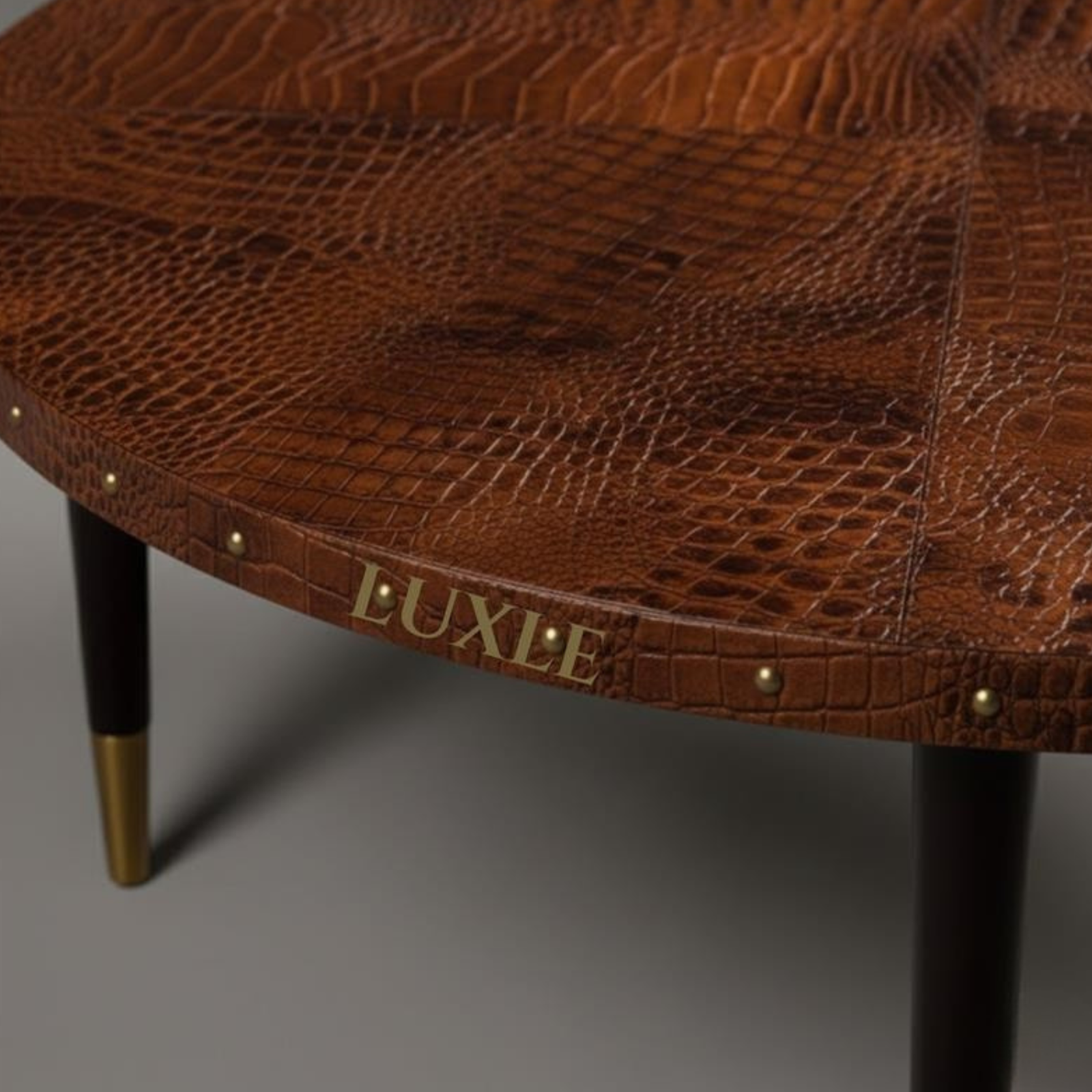 Handcrafted using embossed genuine leather, this round centre table features refined rivet detailing that adds depth without overpowering the design. Supported by polished teak wood legs with gold-finish metal caps, it is a balanced blend of craftsmanship, durability, and understated style.